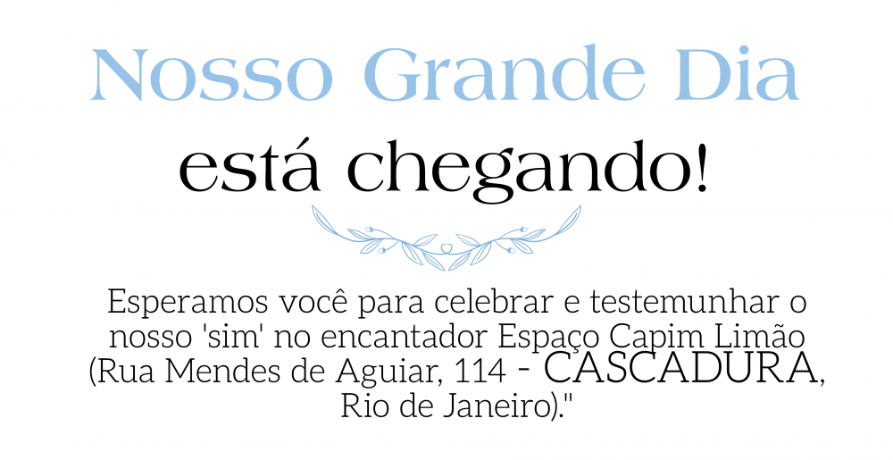 Criamos esse site para compartilhar com vocês os detalhes da organização do nosso casamento. Estamos muito felizes e contamos com a presença de todos no nosso grande dia! Ah, é importante também confirmar sua presença. Para isto contamos com sua ajuda clicando no menu “Confirme sua Presença” e preenchendo os dados necessários. Para nos presentear, escolha qualquer item da Lista de Casamento. Fiquem à vontade! Aguardamos vocês no nosso grande dia!